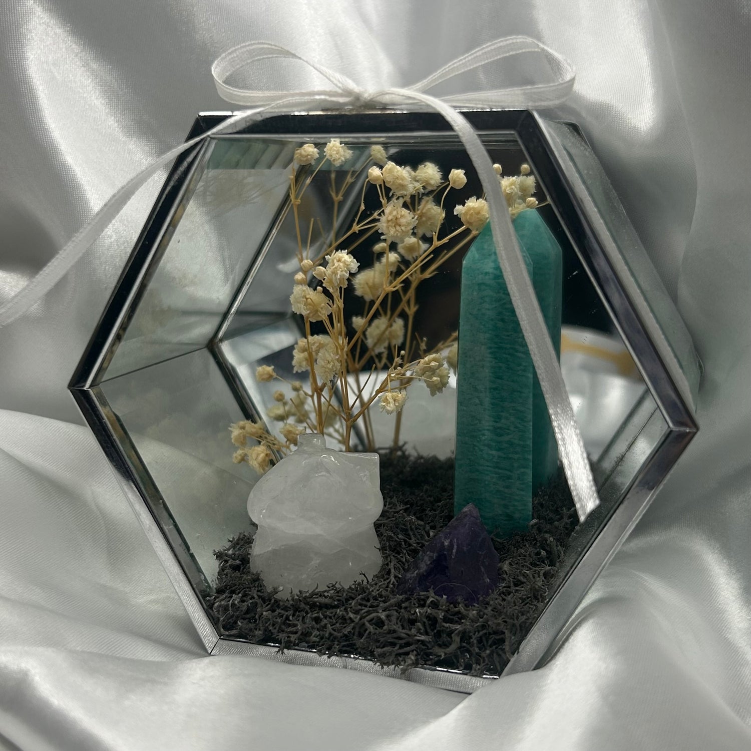 handmade terrariums - including genuine, handpicked healing crystals & hand dried/faux foliage.