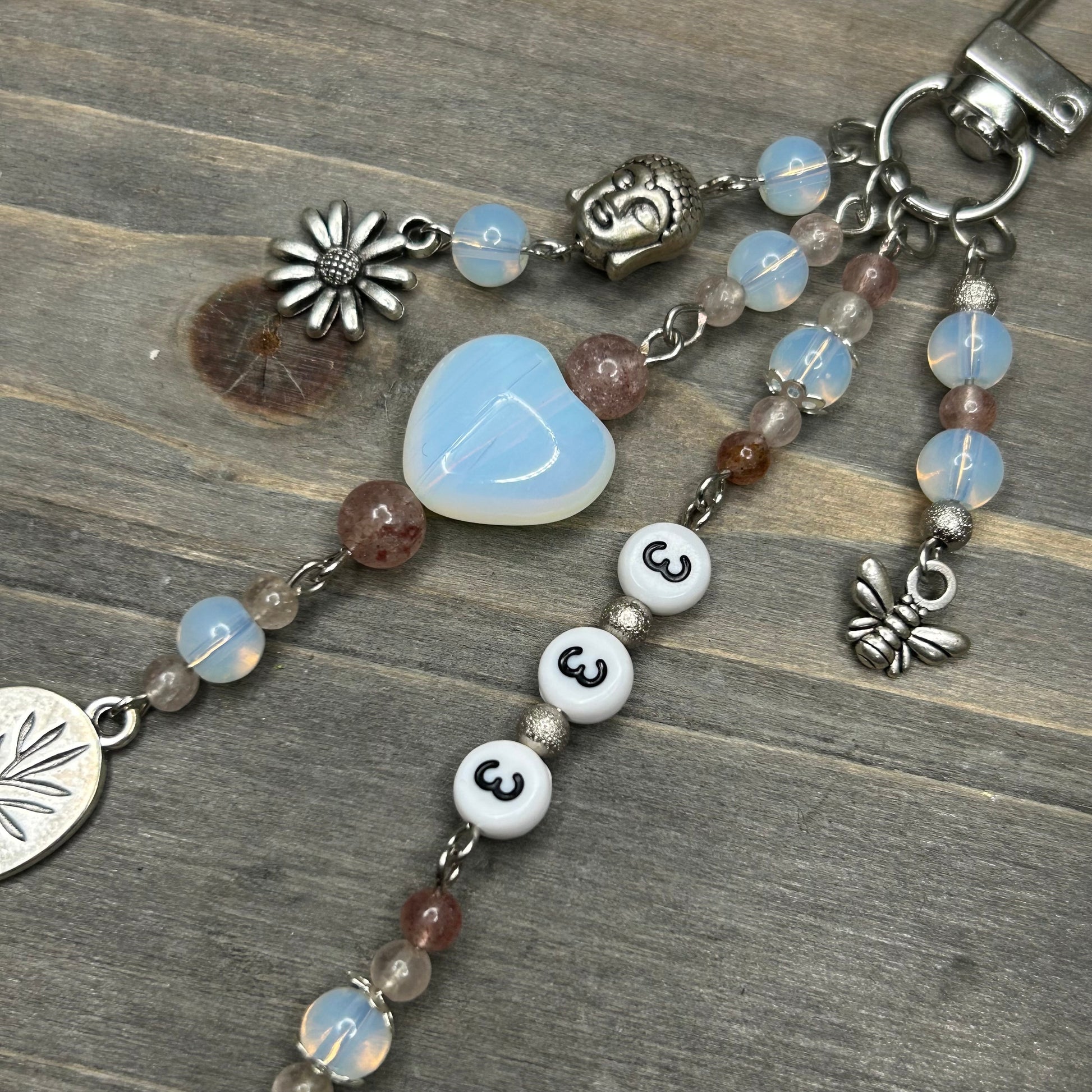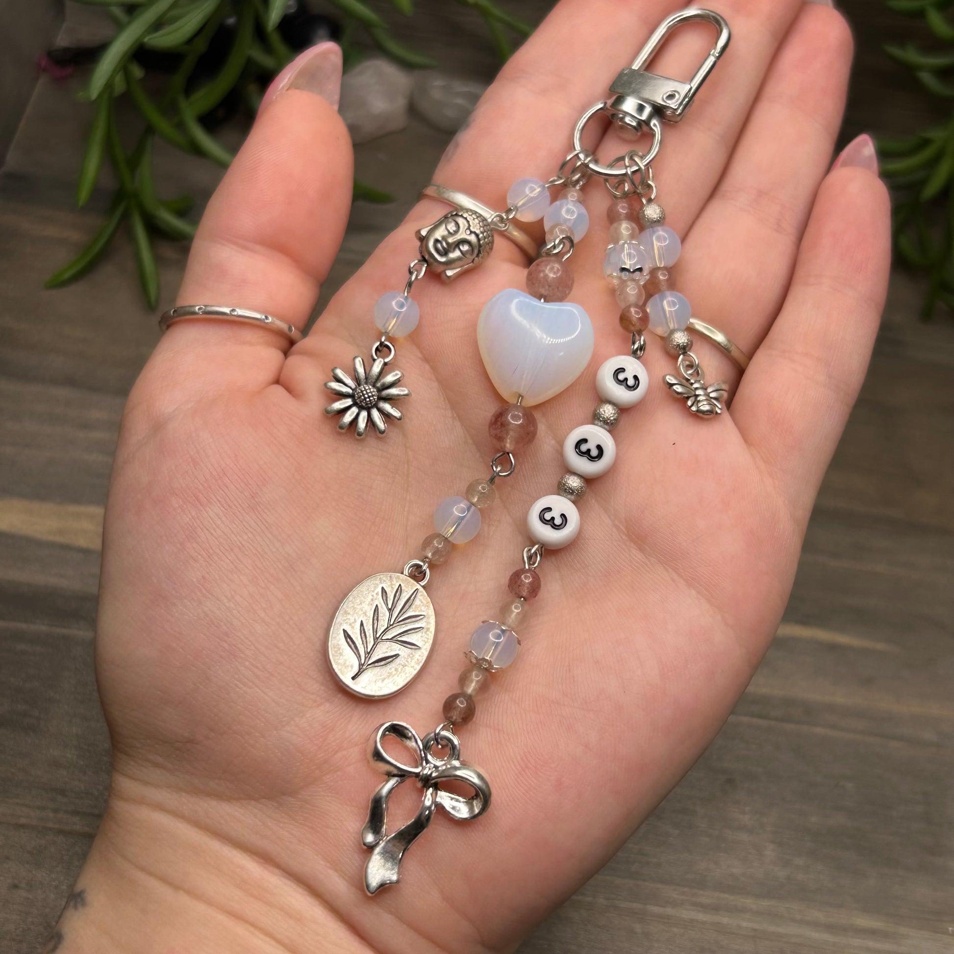 handcrafted opalite & strawberry quartz bag charm/keychain.